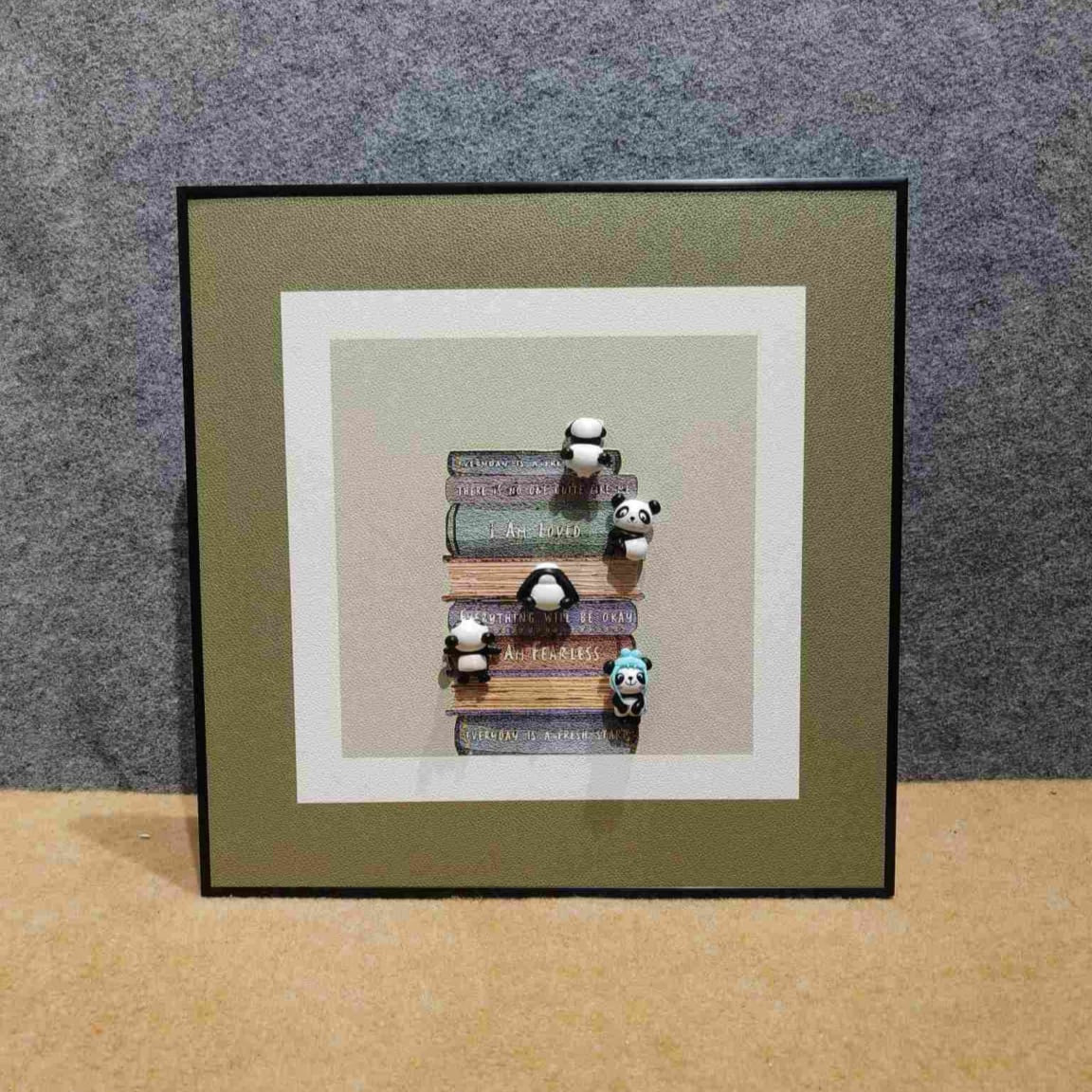 Bring a touch of adorable charm and literary whimsy to your décor with the "Panda Reading Nook" wall art. This square piece depicts a delightful stack of textured books in muted pastel shades, each featuring different handwritten-style titles such as "The Future Is Bright," "I Am Loved," "Everything Will Be Okay," and "Be Fearless." Playfully perched atop and nestled amongst the books are several small, three-dimensional panda figures crafted with black and white felt or similar textured material. Each panda has its own unique pose and even a tiny blue beanie on one, adding to their individual charm. The artwork is set against a soft, textured off-white background and framed by a coordinating light olive-green inner border and a sleek black outer frame, creating a heartwarming and unique addition to any space.