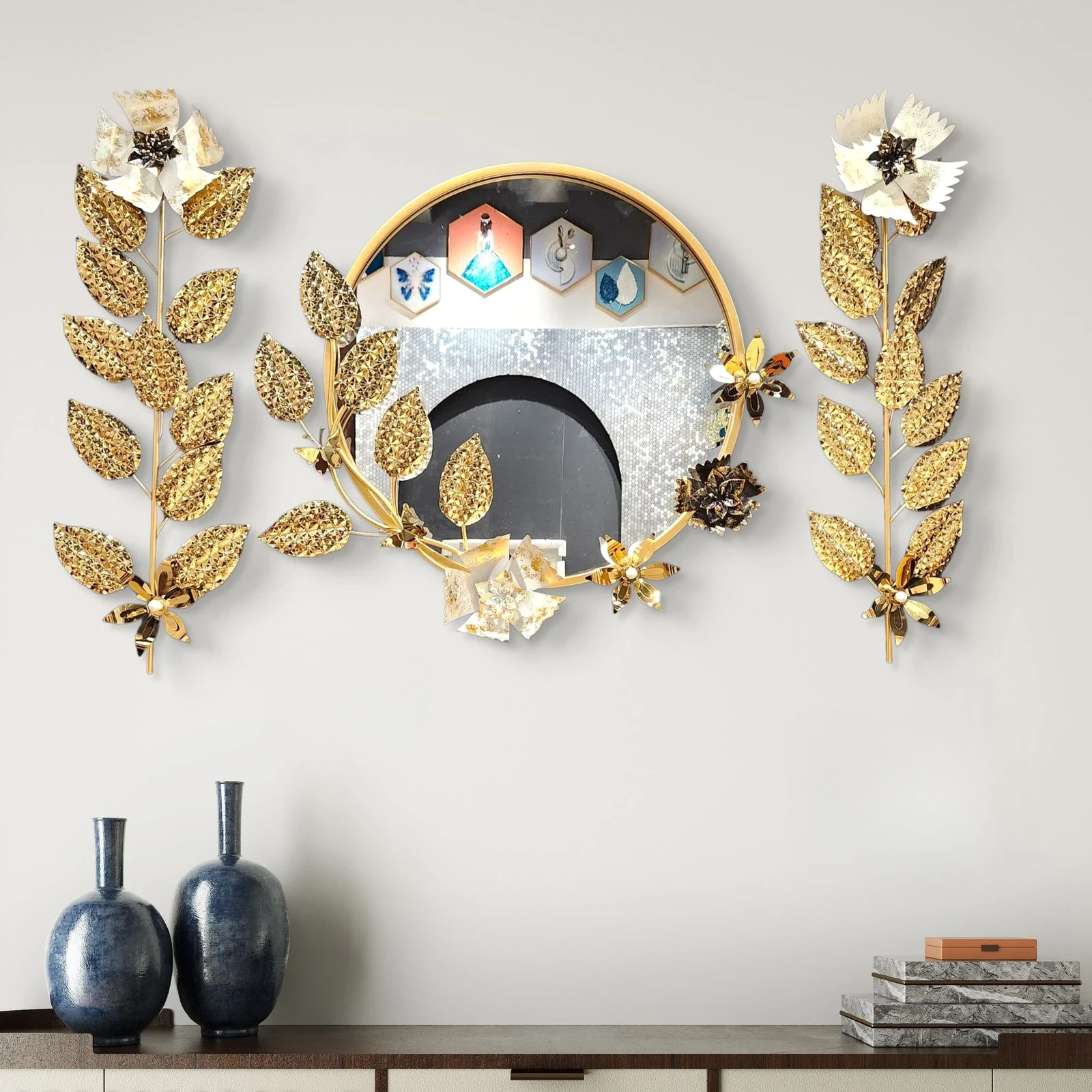 Design Theme: Combines a circular mirror framed with intricate floral and leaf motifs, symbolizing elegance and nature, creating a captivating focal point.