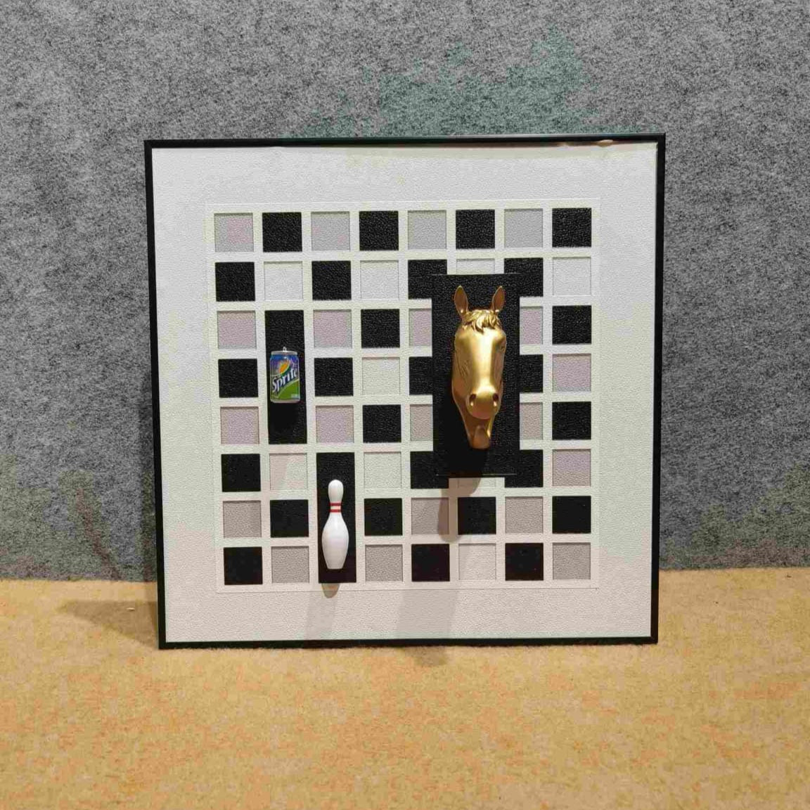 Make a bold and imaginative statement with the "Golden Horse" wall art. This captivating square piece features a high-contrast black and white checkerboard grid. Emerging dramatically from the center of the grid is a striking, three-dimensional golden horse head sculpture, creating a powerful focal point. The surreal scene is completed by two miniature, three-dimensional elements: a white bowling pin and a green Sprite can, which add a playful, pop art-inspired twist to the composition. The artwork is elegantly framed by a white mat and a sleek black outer frame, creating a unique and conversation-starting piece.