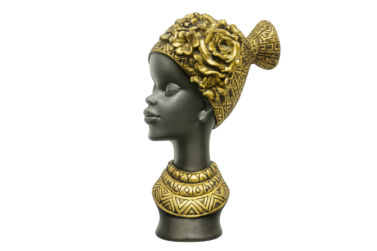 The sculpture features a graceful female profile with a beautifully detailed golden floral headwrap and ornamental necklace, showcasing intricate craftsmanship and cultural richness. The elegant dark matte finish paired with luxurious gold detailing creates a striking contrast, making this piece a stylish decorative accent.