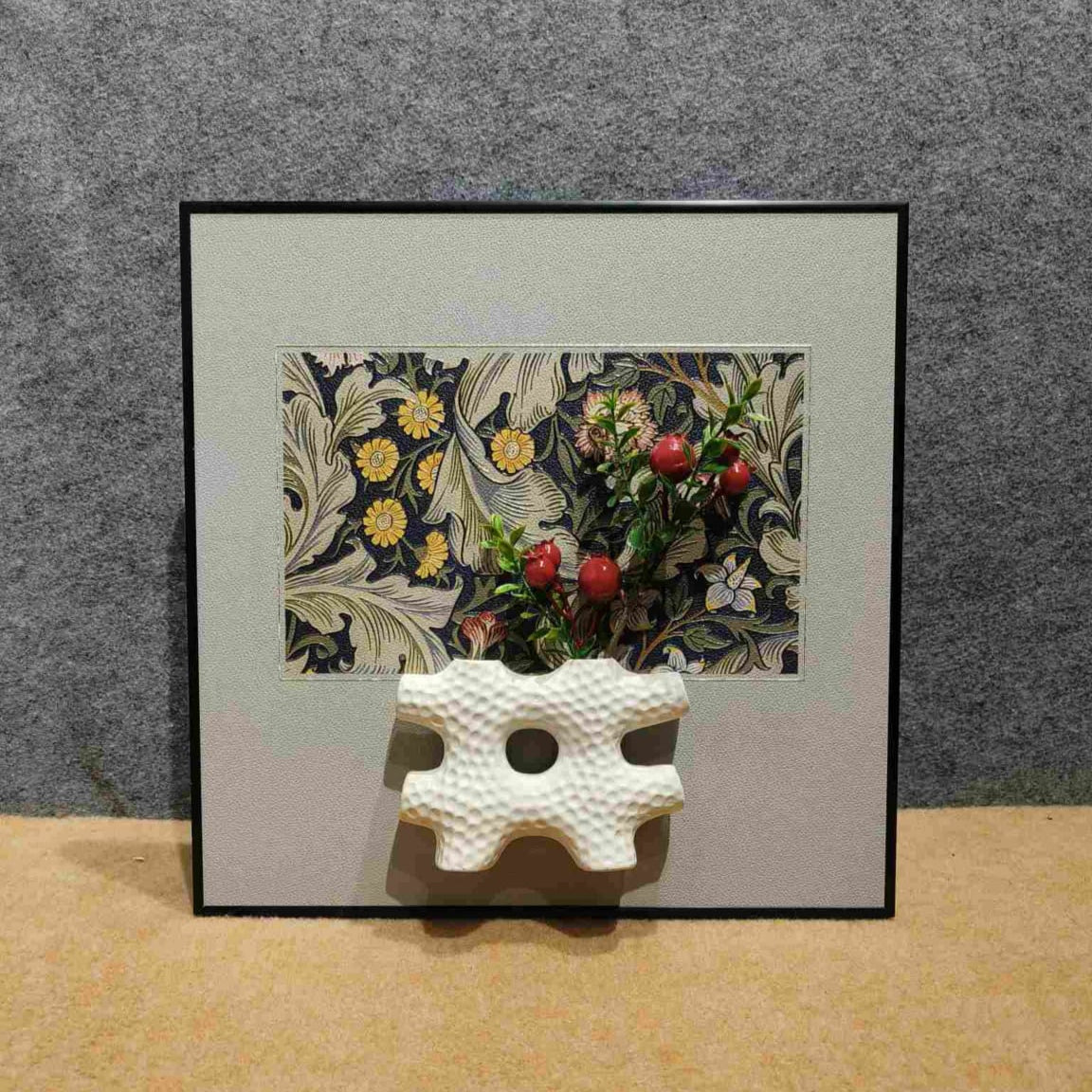 Bring a touch of timeless botanical beauty to your home with the "Floral Embrace" wall art. This square piece features a rectangular section showcasing a classic, detailed floral pattern with dark green leaves, yellow flowers, and small red berries, reminiscent of vintage wallpaper. Attached in relief below this patterned area is a unique, modern white ceramic holder with an abstract, perforated form. Nestled within this holder are small, lifelike stems bearing bright red berries and green leaves, creating a delightful three-dimensional effect that brings the printed floral design to life. The artwork is set against a soft grey background and framed by a sleek black outer frame, offering a charming blend of traditional and contemporary styles.