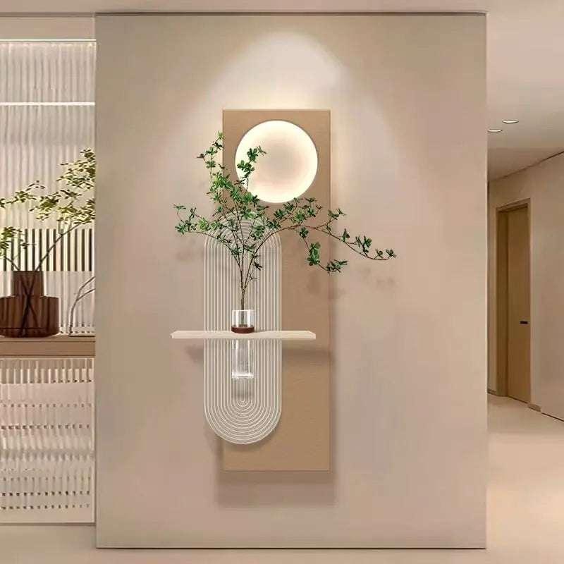 Elevate your interior with this captivating "Lunar Arbor" Modern Illuminated Wall Art. This unique vertical piece features a stunning top-lit circular halo and an elegantly curved and textured panel below. A sleek shelf provides the perfect spot for you to display your own decorative elements, creating a serene, artistic, and visually striking focal point for any contemporary space.