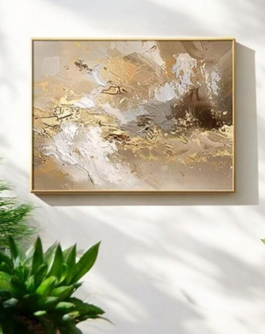 Transform your space with the "Golden Sands" 3D Textured Handcrafted Landscape Painting. This elegant artwork features an abstract blend of golden, beige, and white tones, crafted with rich three-dimensional texture. The thick, sculpted layers create a tactile, immersive focal point, adding a touch of luxury and natural warmth to your home.