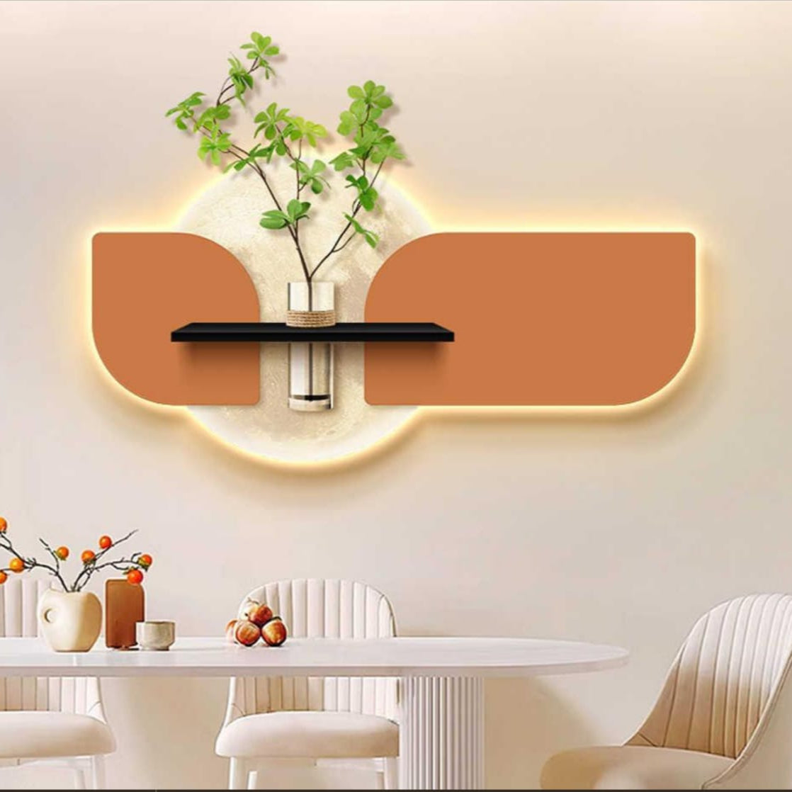 Elevate your living space with the striking "Sunset Horizon" Modern Illuminated Wall Art. This contemporary masterpiece features a captivating abstract design with a warm, sunset-orange primary panel and a glowing circular halo. A sleek black integrated shelf provides a modern spot for you to display your own decorative elements, creating a tranquil and visually dynamic focal point for any wall.