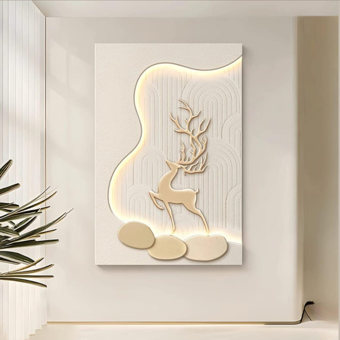 Elevate your interior with this striking "Enchanted Forest Glow" Modern Illuminated Deer Wall Art. This contemporary masterpiece features a captivating 3D relief design of a majestic deer with elegant antlers, set against a subtly textured panel with an undulating, soft glowing light element and organic "pebble" shapes, creating a serene and enchanting visual experience.