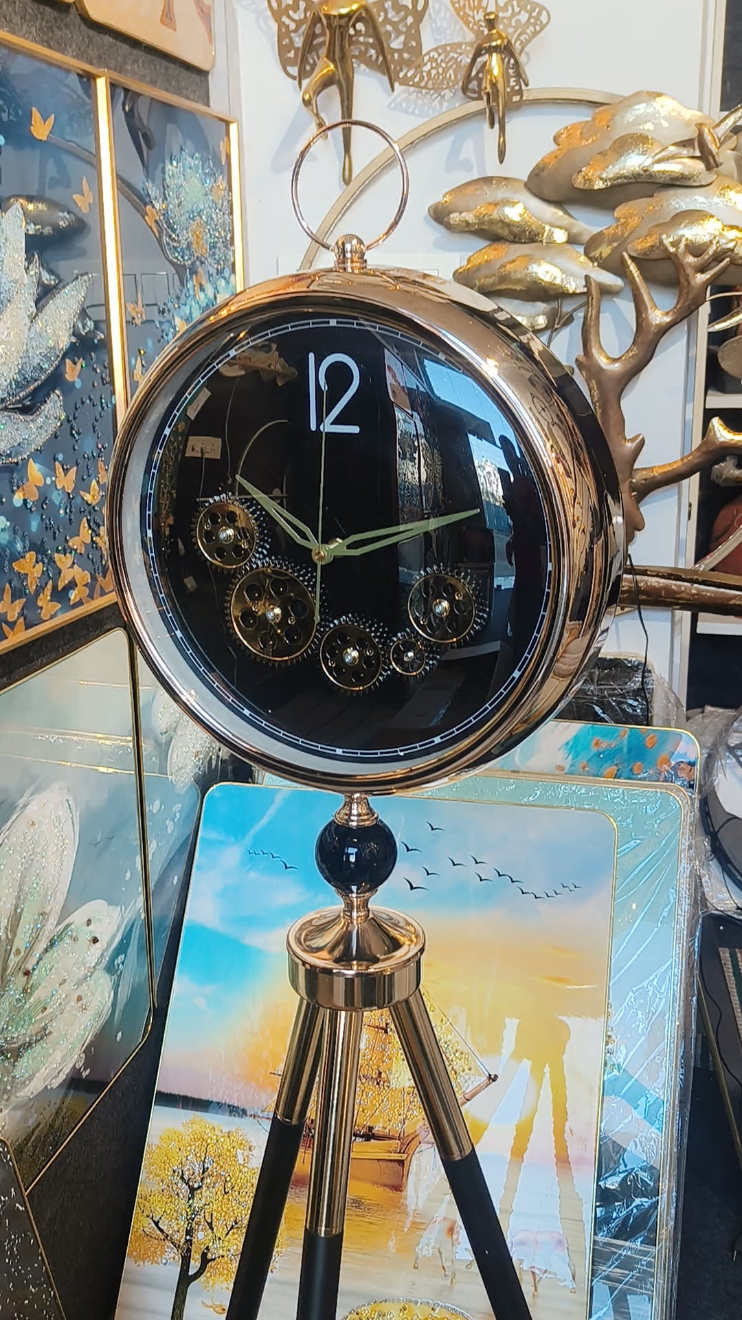 Supported by a sleek black-and-gold tripod stand, this clock ensures both stability and style, perfect for corners, entryways, or focal walls. -