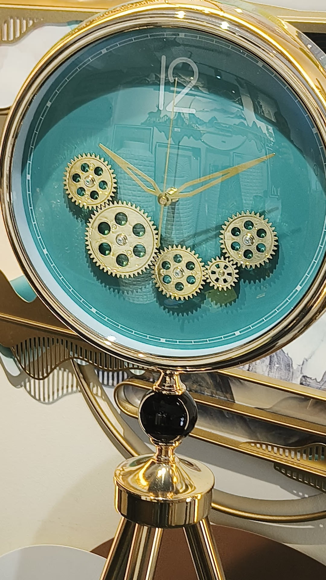 The visible mechanical gears at the base of the clock face give it a dynamic, kinetic feel, making it more than just a timepiece—it’s a work of art. -