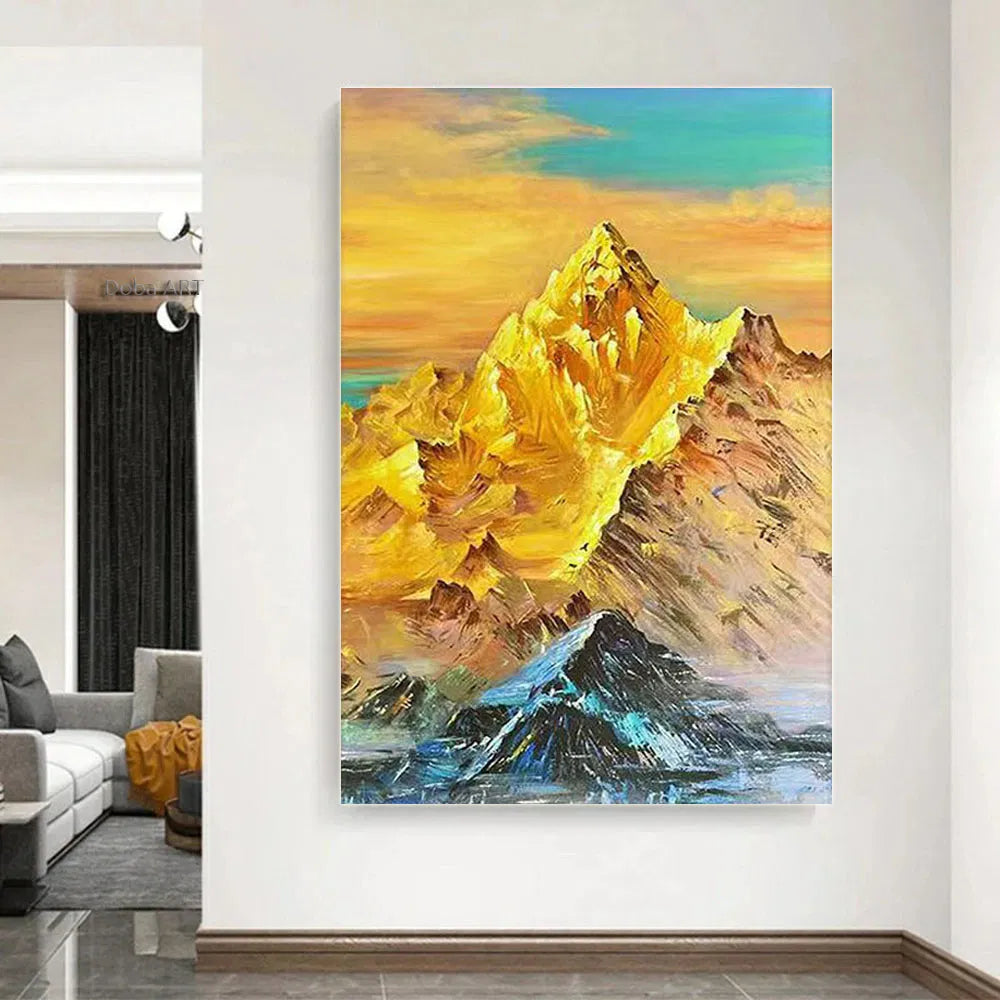 Enhance your space with the "Golden Summit" 3D Textured Handcrafted Landscape Painting. This striking vertical artwork showcases a majestic mountain bathed in golden light against a colorful sky, crafted with rich three-dimensional texture. The thick, sculpted peaks and layered slopes create a tactile, immersive focal point, blending natural beauty with artistic flair.