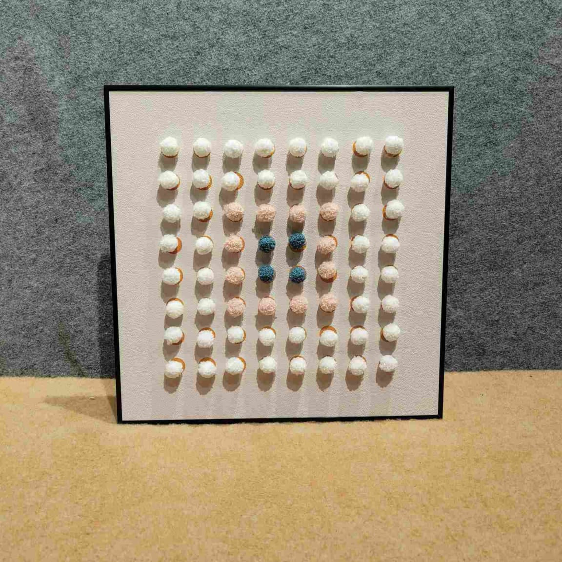 Introduce a delightful tactile experience and a subtle splash of color to your décor with the "Textured Gradient" wall art. This square piece features a منظم grid of small, textured pom-poms adhered to a soft, light pink background. The pom-poms create a gentle gradient of color, transitioning from pure white at the edges to soft blush tones in the middle, with a striking cluster of deep teal pom-poms forming a central focal point. The raised texture of the pom-poms adds a playful three-dimensional element to the artwork. Finished with a sleek black outer frame, this piece offers a charming and contemporary touch to any space.