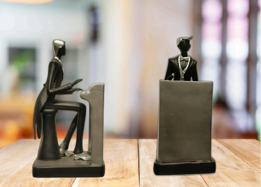 Introduce a touch of artistic sophistication and musical inspiration to your home with this Elegant Pianist Sculpture Set. This striking duo features two meticulously crafted figurines: one depicting a pianist gracefully seated at his instrument, lost in the melody, and the other a poised conductor ready to lead the orchestra. Their sleek black and silver finish exudes modern elegance, making them a captivating addition to any décor.
