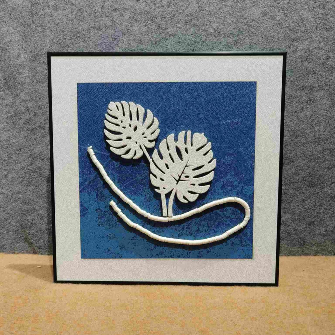 Bring a touch of lush, tropical charm to your living space with the "Tropical Serenity" textured wall art. This square piece features a vibrant blue backdrop, evoking the depths of a tropical sky or sea. Two stylized, textured white Monstera leaves are prominently displayed, their iconic fenestrations adding a bold botanical element. A flowing, textured white stem connects the leaves, creating a sense of organic growth and harmony. The artwork is framed by a subtle light-toned border and a sleek black outer frame, offering a modern and refreshing accent for any room.