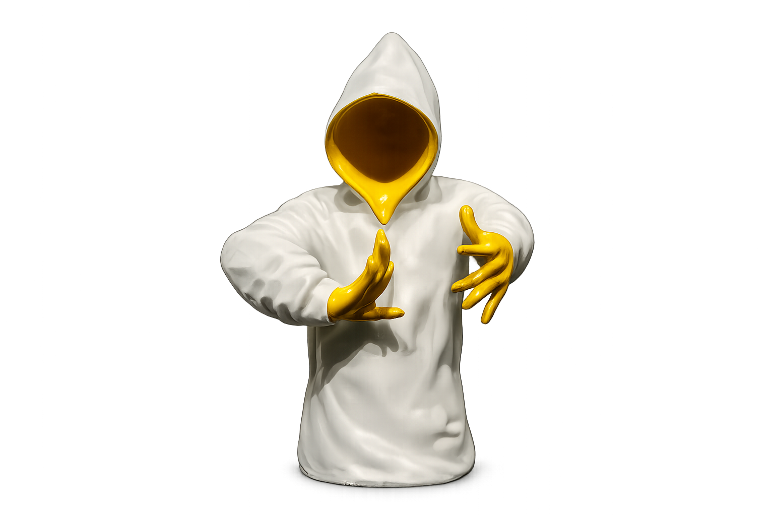 The sculpture features a hooded figure with expressive hand gestures, symbolizing creativity and individuality. The contrast of the minimal white hoodie with vibrant yellow hands and face detailing creates a striking visual effect, giving the sculpture a modern artistic appeal.