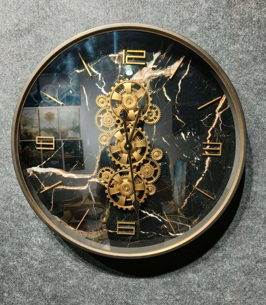- Striking Design: A captivating arrangement of a circular clock face with a luxurious black and gold marbled effect, showcasing intricate golden gears at its center, creates a visually stunning and modern aesthetic.