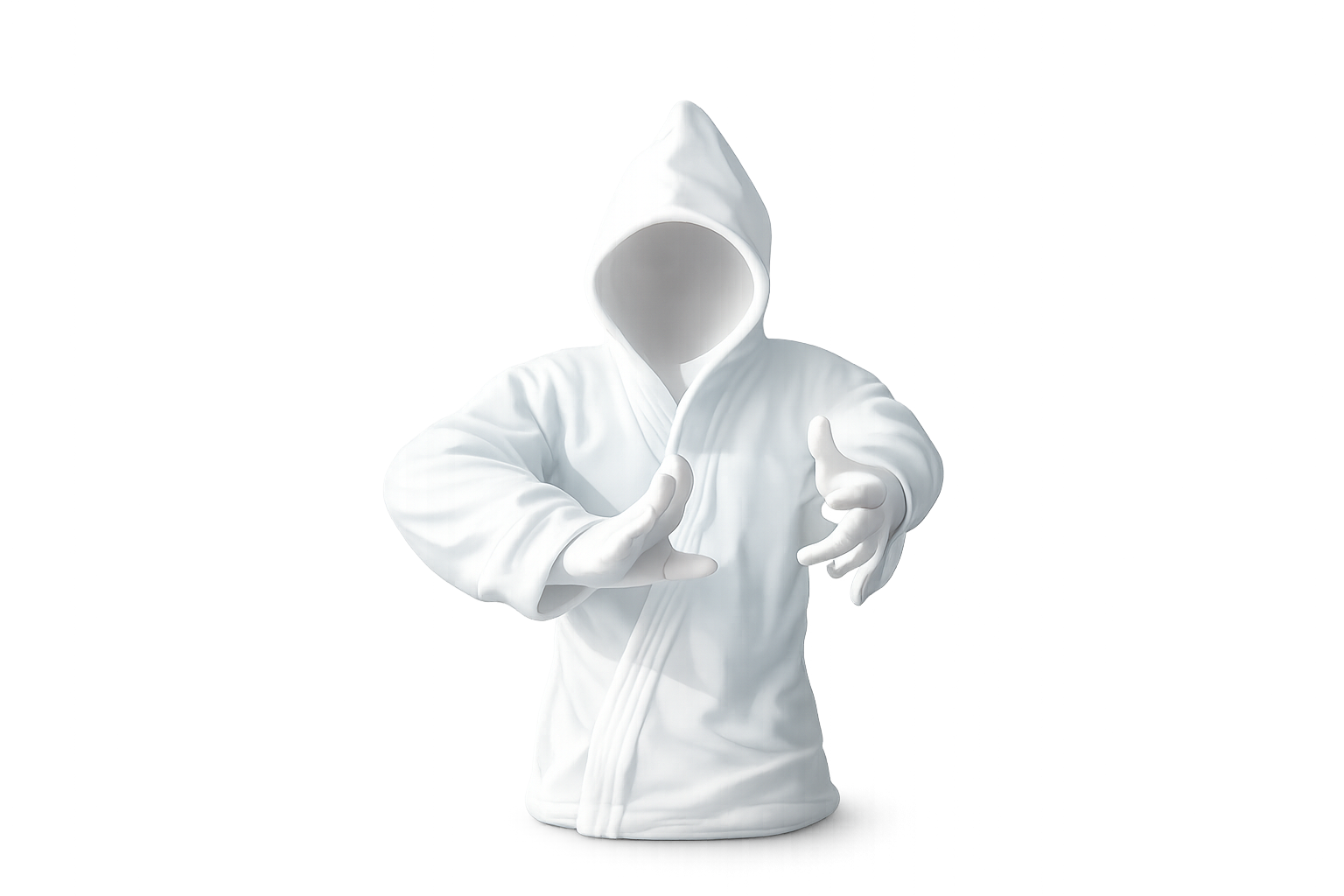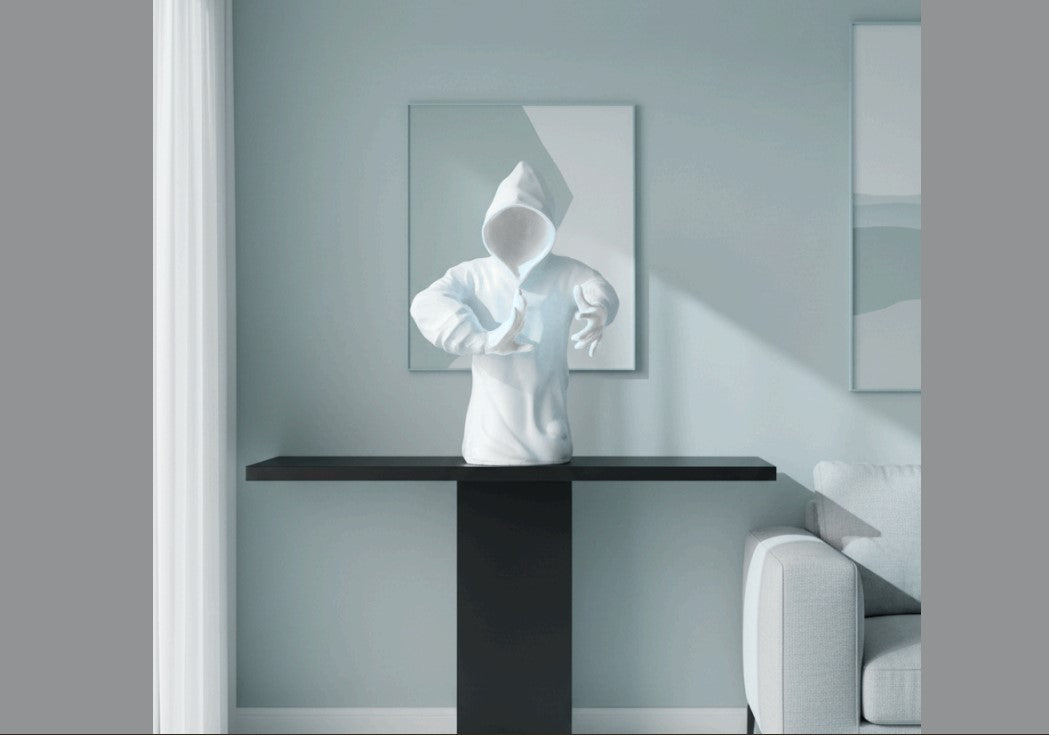 Designed with a contemporary minimalist style, the figurine features a sleek matte white finish that highlights the flowing form of the martial artist in motion. The hooded design and expressive posture give the sculpture a unique and artistic appeal, making it a standout decorative piece for modern interiors.