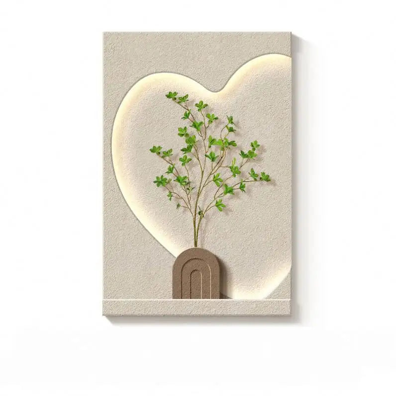 Elevate your interior with this striking "Heart of Nature Glow" Illuminated Modern Wall Art. This captivating vertical piece features a beautifully recessed and softly glowing heart-shaped panel, seamlessly integrated with a minimalist planter holding vibrant artificial green branches. It creates a serene, romantic, and visually compelling focal point for any contemporary space.
