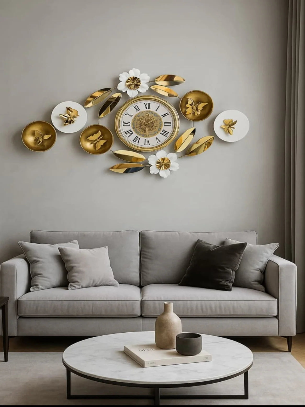 - Design Theme: Combines a circular clock face with an elegant display of golden geometric shapes and butterfly accents, creating a luxurious and whimsical botanical aesthetic.