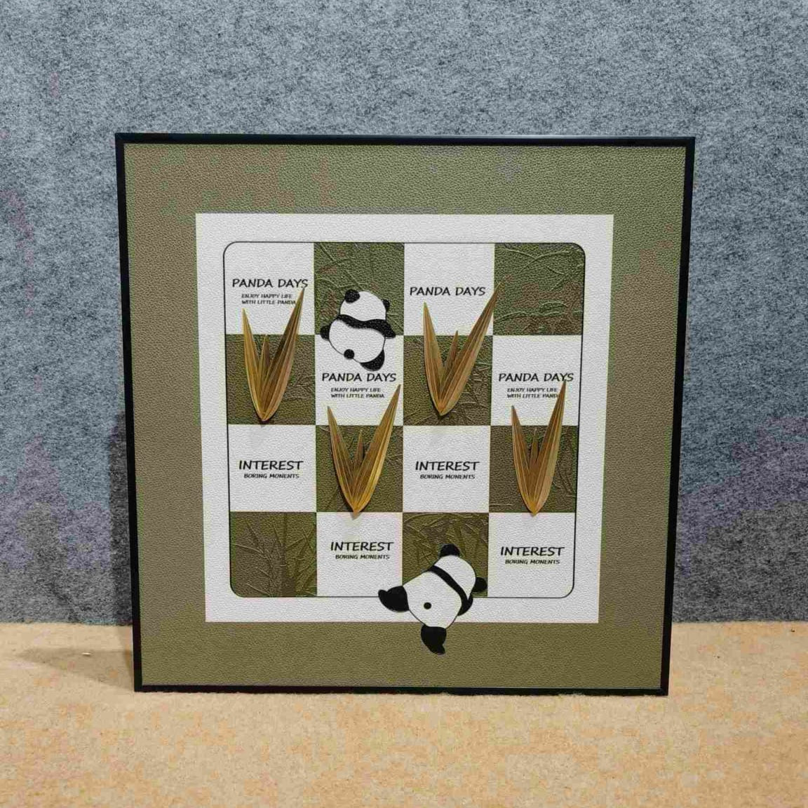 Add a touch of playful charm and textured detail to your space with the "Panda Patchwork" wall art. This square piece features a whimsical patchwork design of alternating squares in textured light green and off-white hues. Adorning some of these squares are adorable, stylized panda figures crafted with black and white felt or similar textured material. Interspersed among the pandas are clusters of textured, golden wheat-like elements. Each square also features small printed text labels, such as "PANDA DAYS," "ENJOY HAPPY LIFE," and "INTEREST BORING MOMENTS," adding to the quirky and engaging nature of the piece. The artwork is finished with a coordinating light olive-green inner border and a sleek black outer frame, creating a delightful and unique addition to any room.