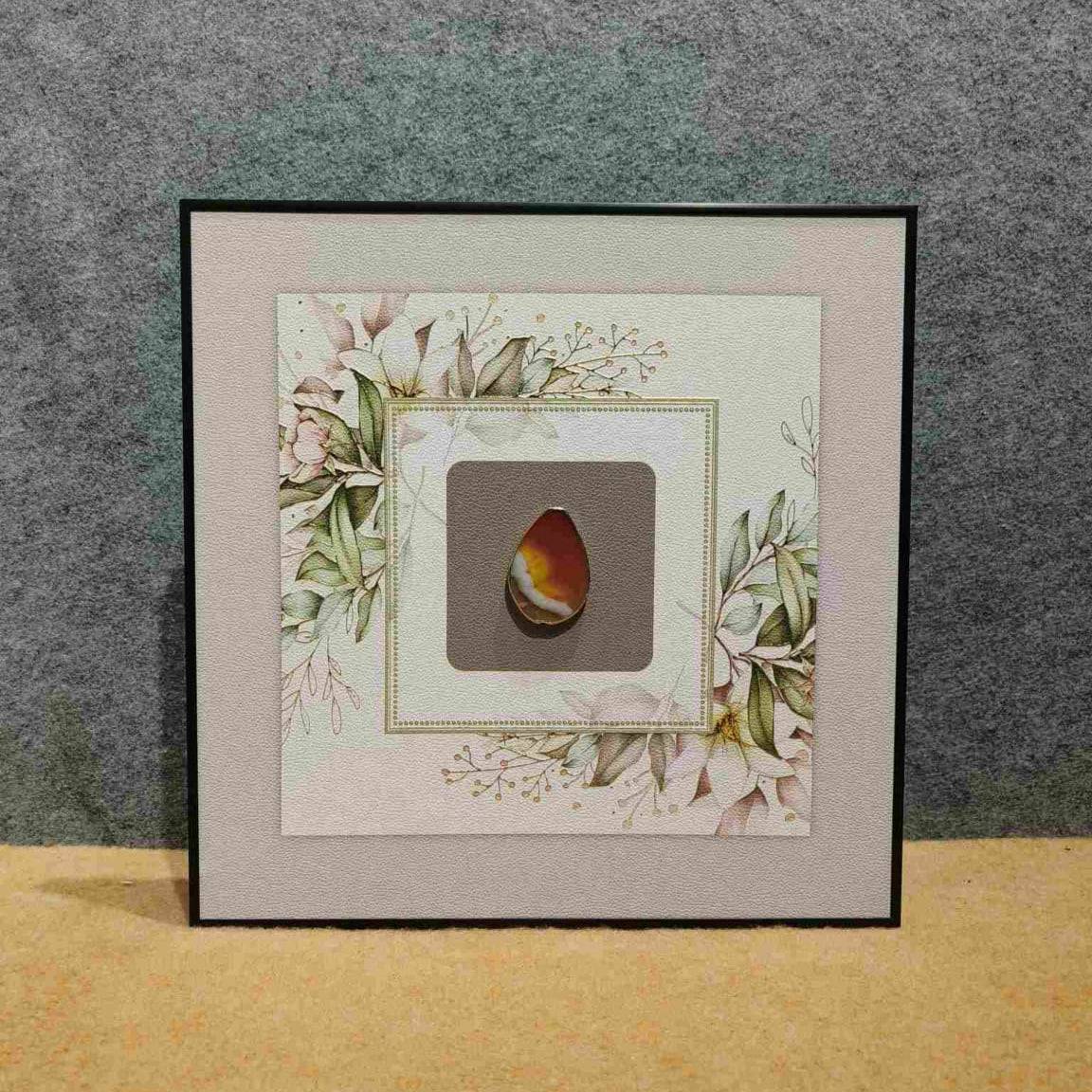 Bring a subtle touch of natural artistry to your home with the "Nature's Gem" framed artwork. This square piece features a smooth, polished stone with rich earth tones of brown, orange, and cream as its focal point, carefully mounted on a small, square, muted brown backdrop. This central element is layered over a delicate background adorned with watercolor-style floral and leaf illustrations in soft pastel shades of green and blush. The artwork is further enhanced by a light beige inner mat and a sleek black outer frame, creating a serene and elegant presentation of organic beauty.