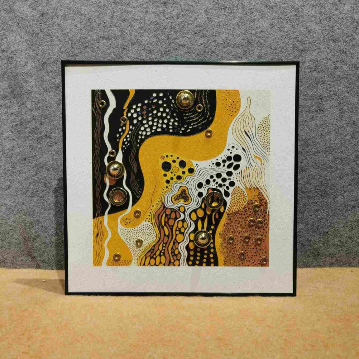 Vibrant Color Palette: A bold and sophisticated mix of neutral black and white with warm, earthy shades of ochre and brown, highlighted by pops of gold. The piece is neatly contained within a black frame.