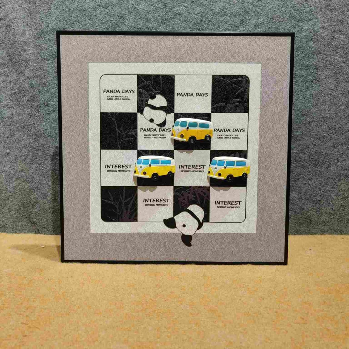 Embark on a charming adventure with the "Panda Road Trip" wall art. This square piece features a playful patchwork design of alternating squares in textured light grey and white hues. Adorning some of these squares are adorable, stylized panda figures crafted with black and white felt or similar textured material, seemingly waving or looking on. In place of the botanical elements from a similar design, this piece showcases four miniature, three-dimensional yellow and white camper vans, adding a delightful travel theme. Each square also features small printed text labels, such as "PANDA DAYS," "ENJOY HAPPY LIFE," and "INTEREST BORING MOMENTS," contributing to the whimsical narrative. The artwork is finished with a coordinating light grey inner border and a sleek black outer frame, making it a cheerful and unique addition to any room.