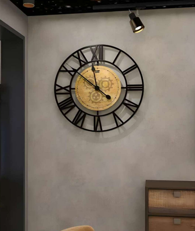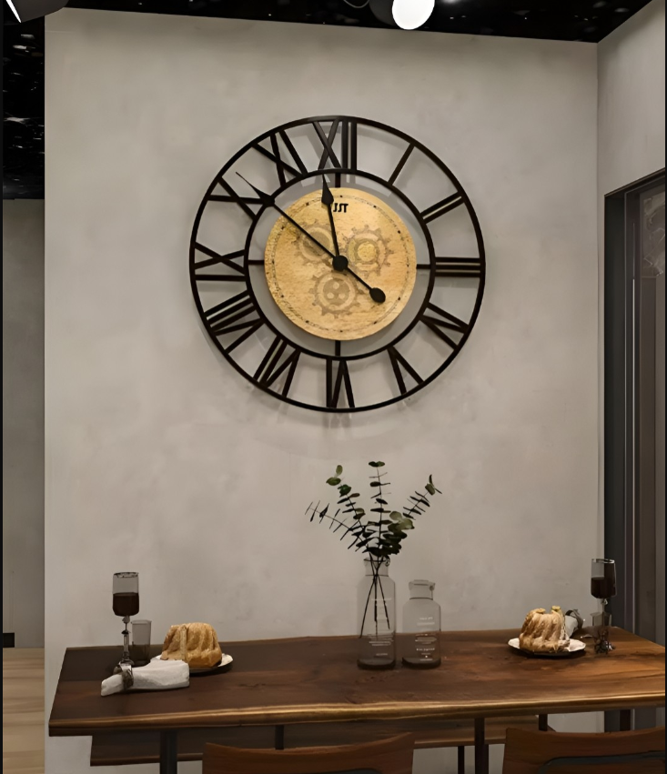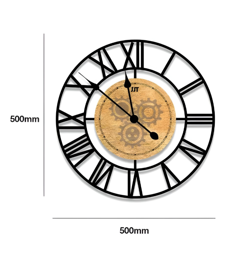 - Unique Design: A large, circular clock face with Roman numerals encased within a bold, industrial-style metal frame creates a visually striking and modern aesthetic.