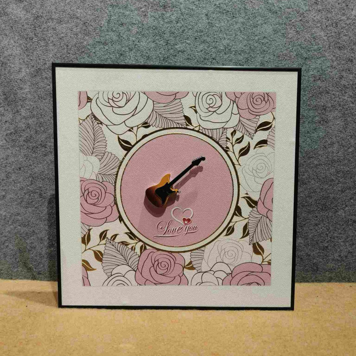 Celebrate the harmony of music and love with the "Musical Blooms" wall art. This charming square piece features a background adorned with a delicate pattern of outlined and subtly shaded pink and white roses, accented with brown leaves. At the center, a raised circular panel in a solid light pink provides a focal point. Upon this circle rests a small, three-dimensional acoustic guitar, casting a subtle shadow. Below the guitar, the cursive script "Love you" adds a heartfelt touch. The artwork is finished with a clean white border and a sleek black outer frame, making it a sweet and artistic addition to any space.