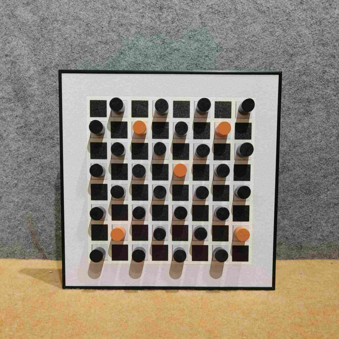 High Contrast: The sharp contrast between the black and white squares and the black and orange pegs makes the design visually striking. The artwork is neatly contained within a black frame.