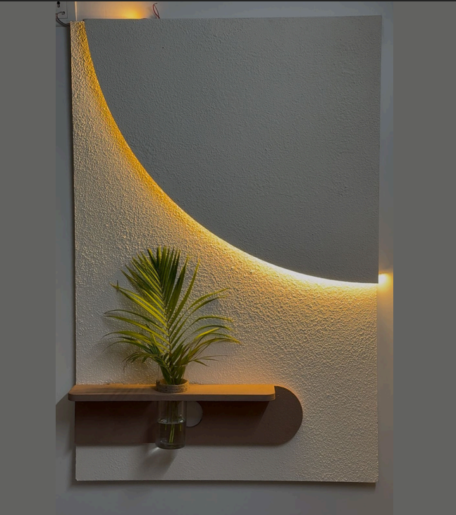Elevate your interior with this striking "Lunar Arc" Illuminated Modern Wall Art. This captivating vertical piece features a prominent, sweeping illuminated arc with a textured surface, creating a dynamic and inviting glow. An integrated dark shelf with a sleek, rounded extension perfectly cradles a minimalist glass vase with lush artificial greenery, making it an artistic and serene focal point for your wall.