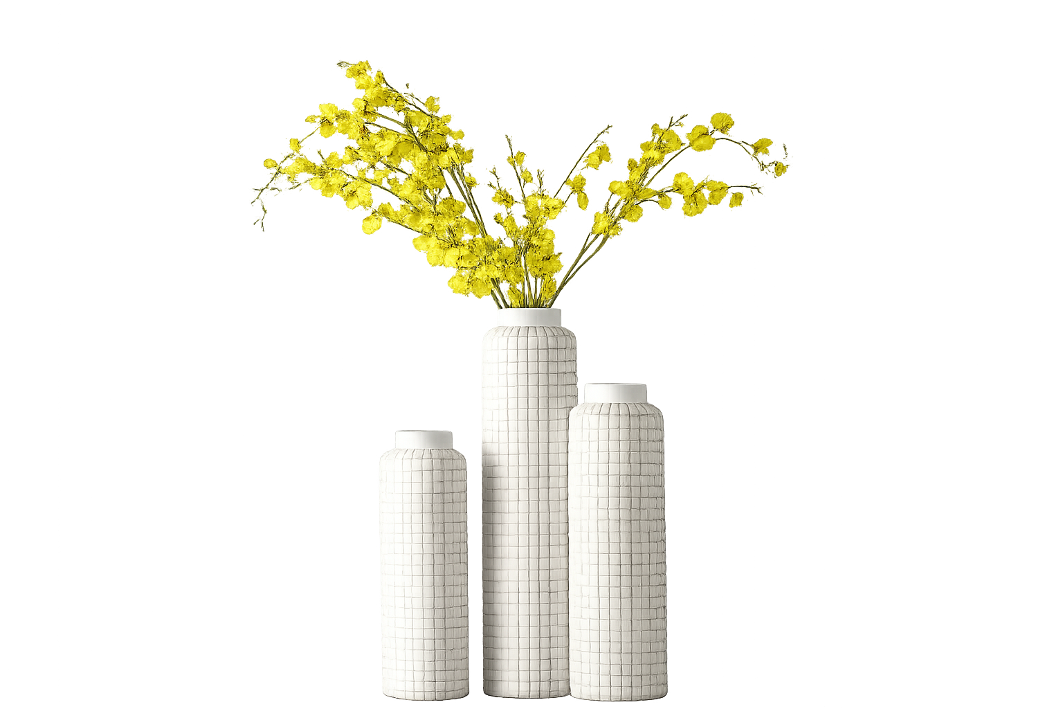 The neutral white finish allows the vases to blend effortlessly with any décor style while highlighting the intricate textured surface. Perfect for displaying fresh flowers, dried stems, or decorative branches, these vases instantly add height, balance, and visual interest to tabletops, consoles, shelves, or dining areas.