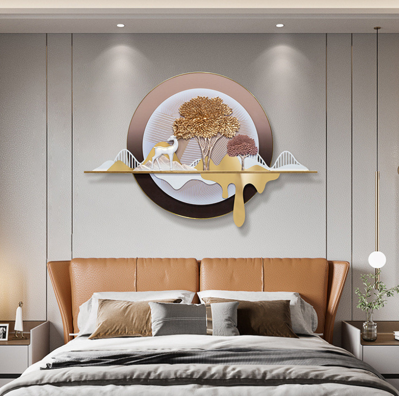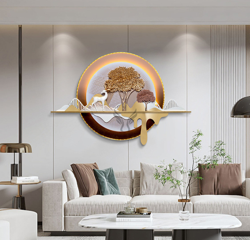 Featuring a serene landscape with a golden deer, lush trees, and a glowing circular halo, this wall art adds a touch of sophistication and tranquility to any room.