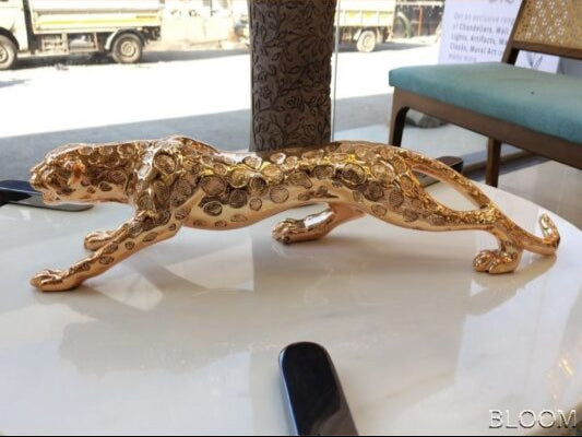 Bring a touch of exotic luxury and untamed beauty to your home with the Gilded Hunter leopard sculpture. This striking piece captures the sleek power and graceful movement of a leopard in a prowling stance. What sets this sculpture apart is its unique, textured surface, adorned with raised, organic shapes that mimic the animal's spots while adding a tactile and visually intriguing dimension.