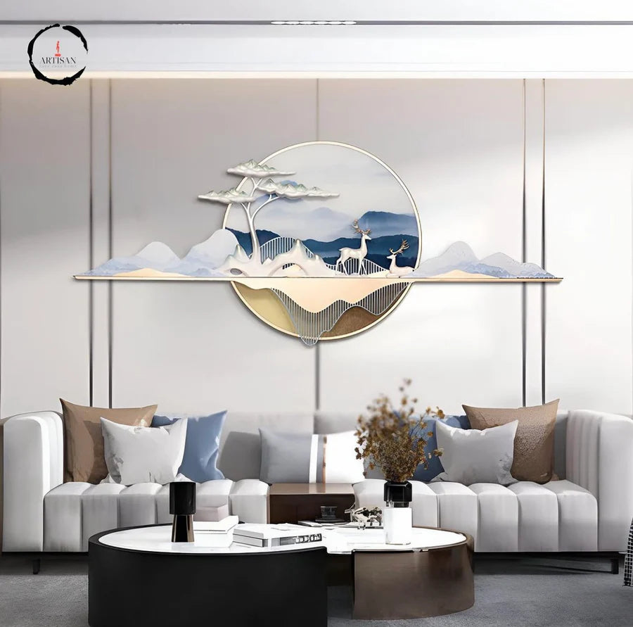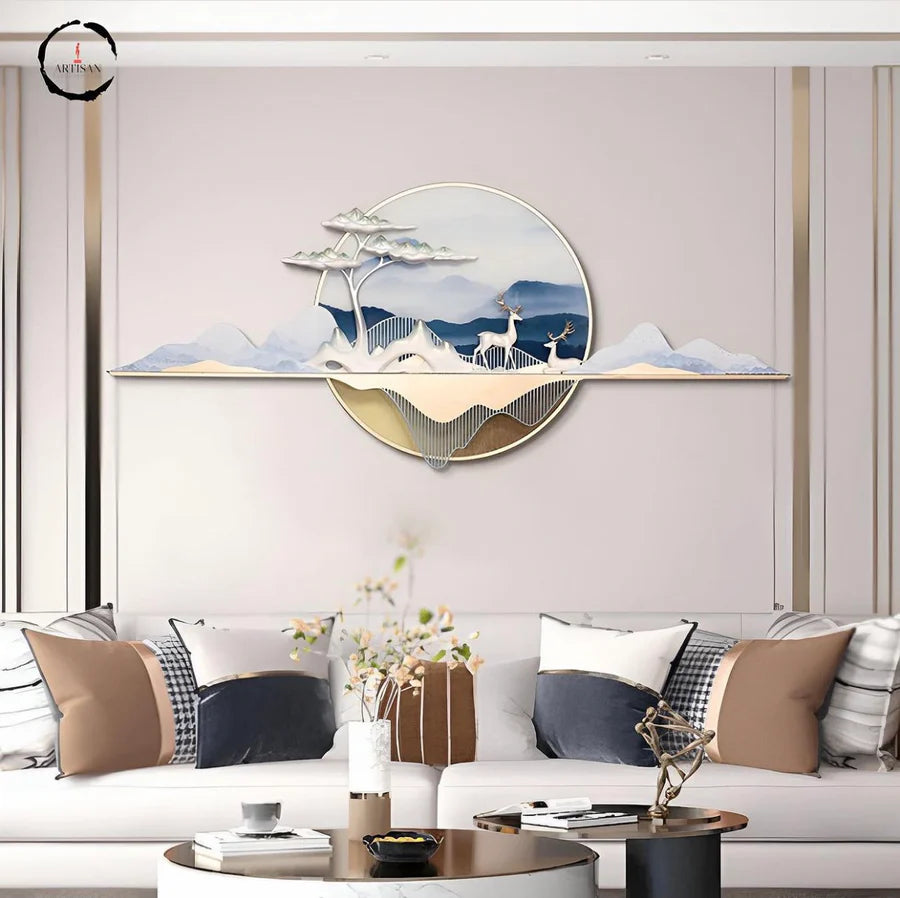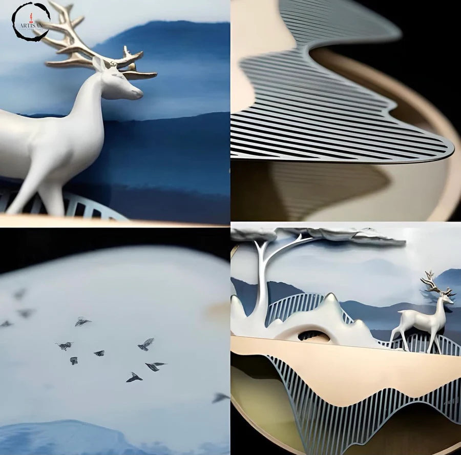 A harmonious blend of serene mountains, delicate trees, and graceful deer within a circular frame, this mural embodies nature's timeless beauty.