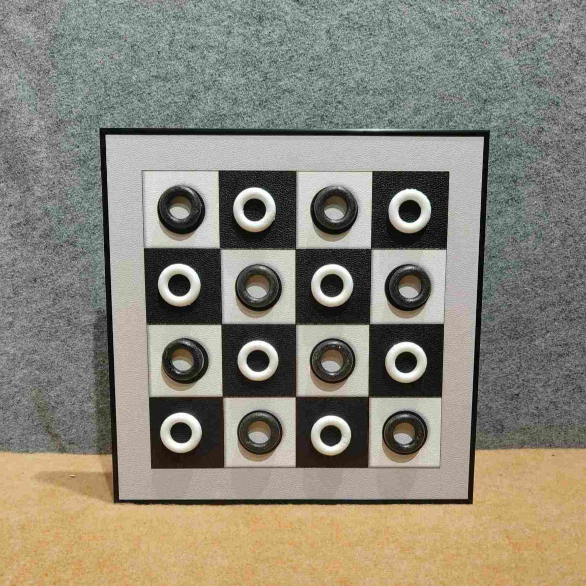 High Contrast Elements: The bold contrast between the black and white rings and the alternating background squares makes the artwork visually dynamic. The piece is neatly finished with a black frame.