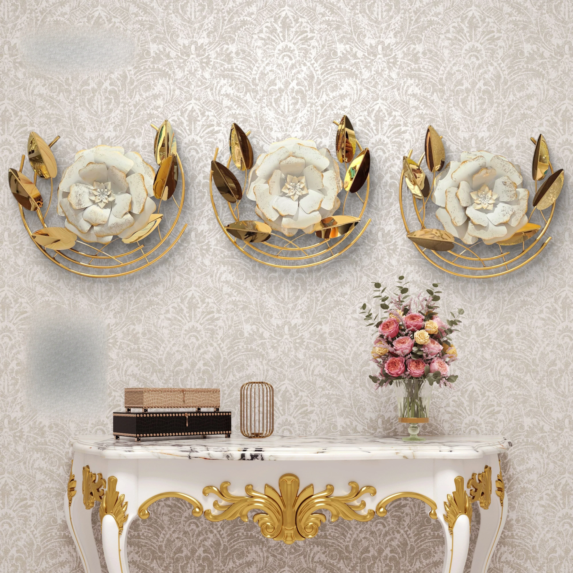 Design Theme: Showcases a trio of circular pieces with embossed rose and leaf patterns, symbolizing elegance and grace, designed to create a cohesive and sophisticated wall display.