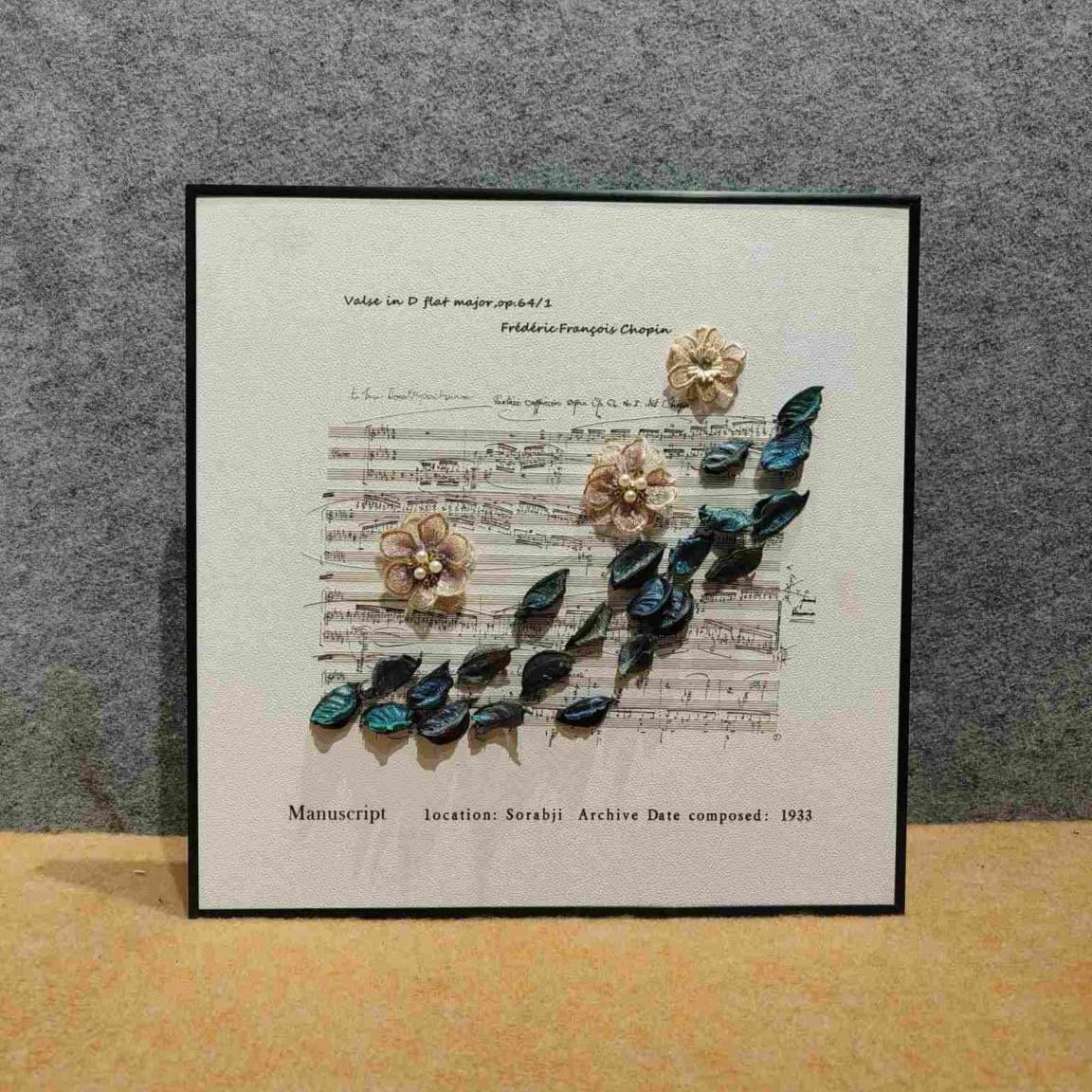 Fuse the timeless elegance of classical music with the delicate beauty of nature with this unique "Chopin's Melody" wall art. This square piece features a background of vintage-style sheet music, bearing the title of a Chopin waltz and details about its origin. A trail of sculpted, three-dimensional flowers and leaves appears to float across the musical notes, with subtle beige blossoms and textured blue-green leaves arranged in a graceful, ascending pattern. This artwork creates a beautiful visual harmony, blending the artistic forms of music and nature in a single, captivating piece.