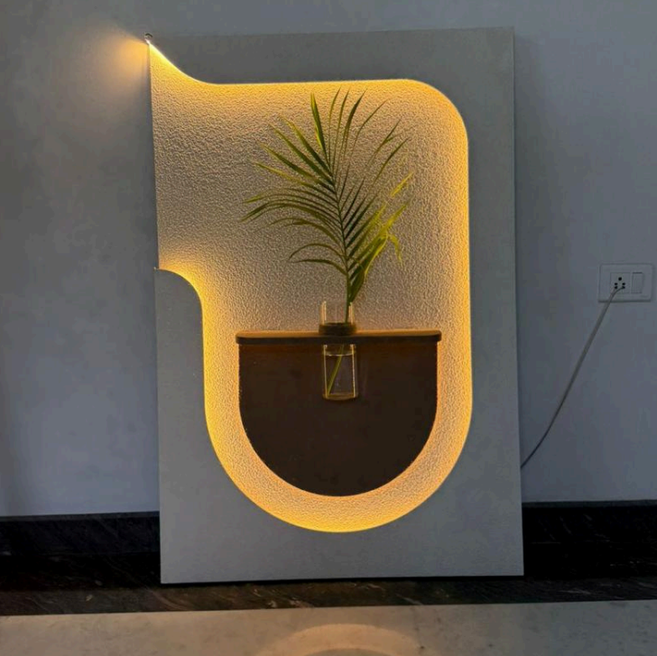 Functional Display Shelf: A sleek, dark-toned shelf is seamlessly integrated into the design, forming a visually cohesive unit with the illuminated recess.